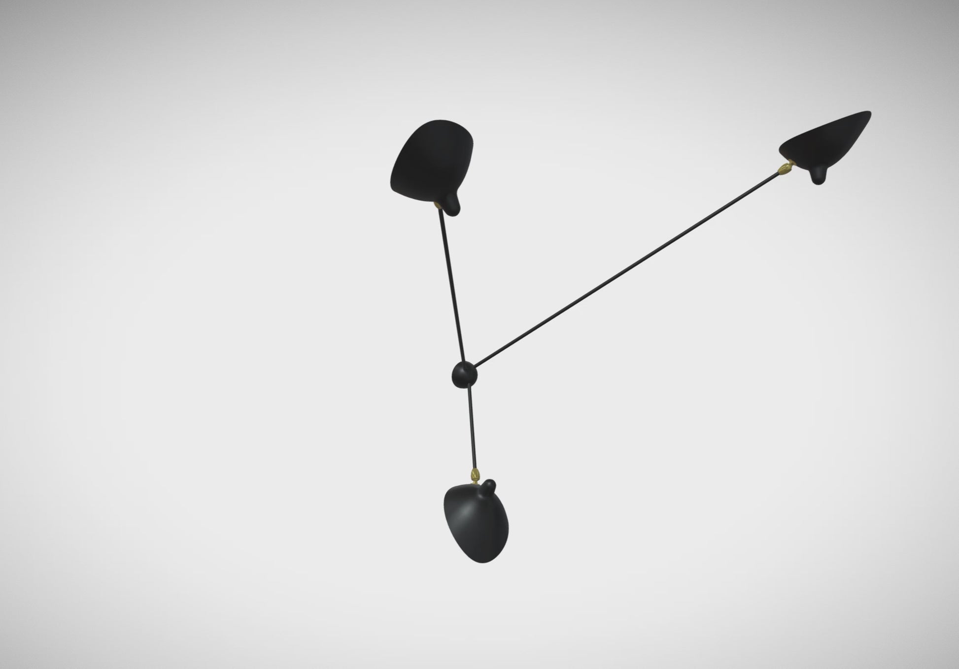 With three stationary arms projecting from the central mount into the room, this lamp becomes a reference point while illuminating the surroundings. Each lamp head tilts and revolves.