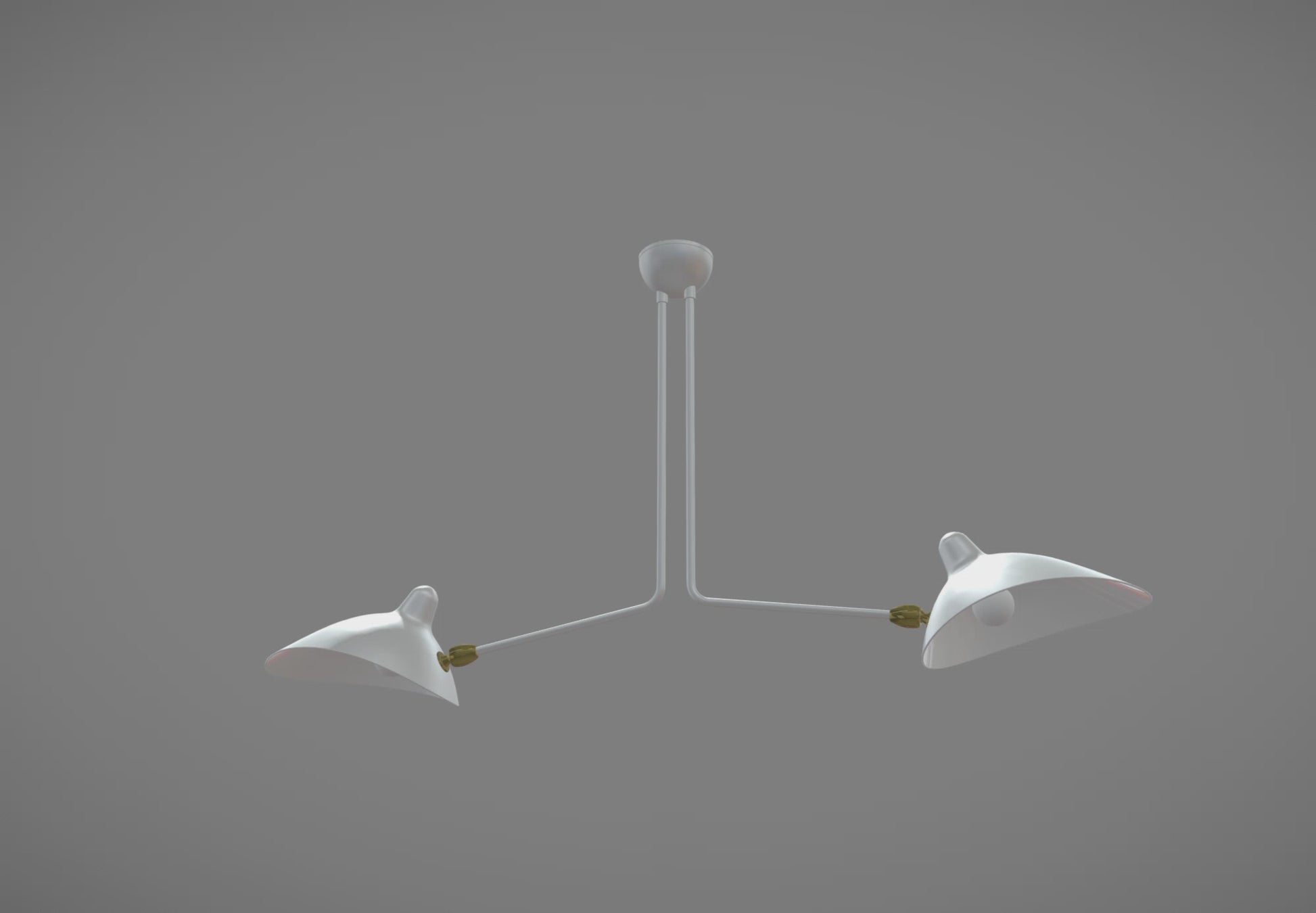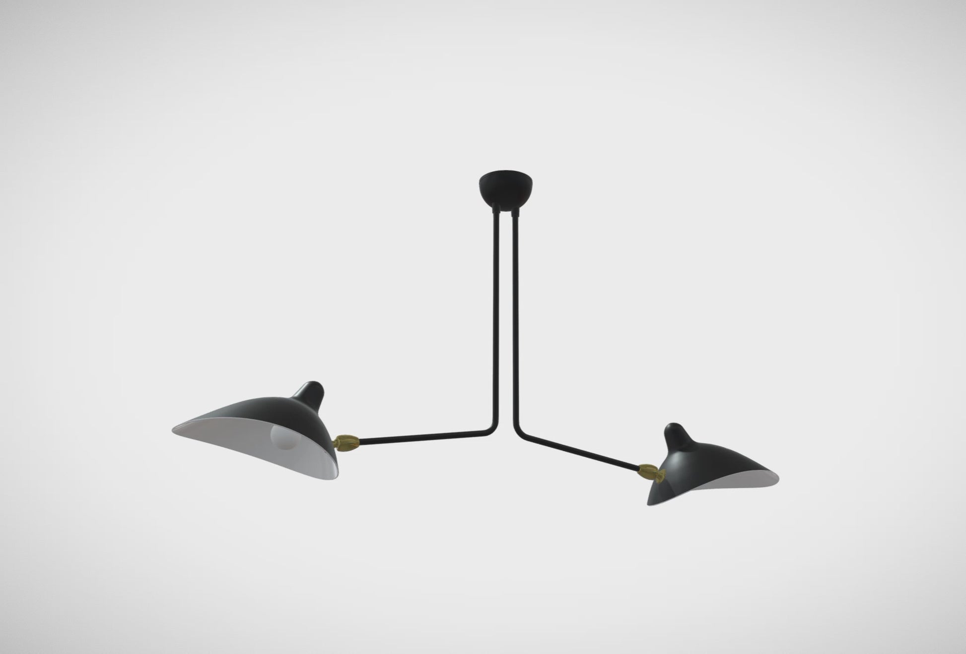 Simple and unique, this ceiling lamp has two fixed symmetrical curved arms with shades that can be rotated to any position. It is an elegant lamp with a small footprint that gives character to any room.