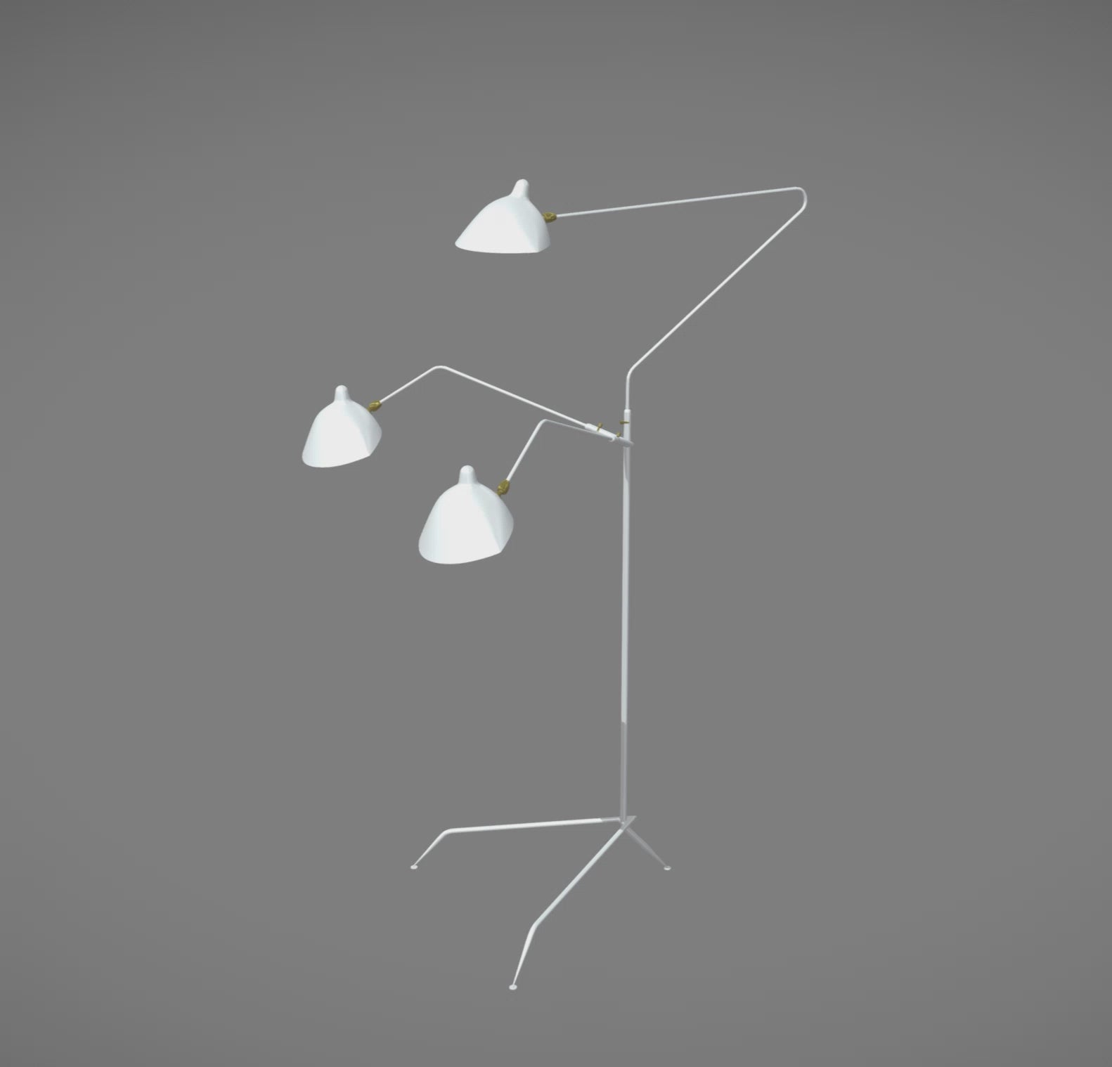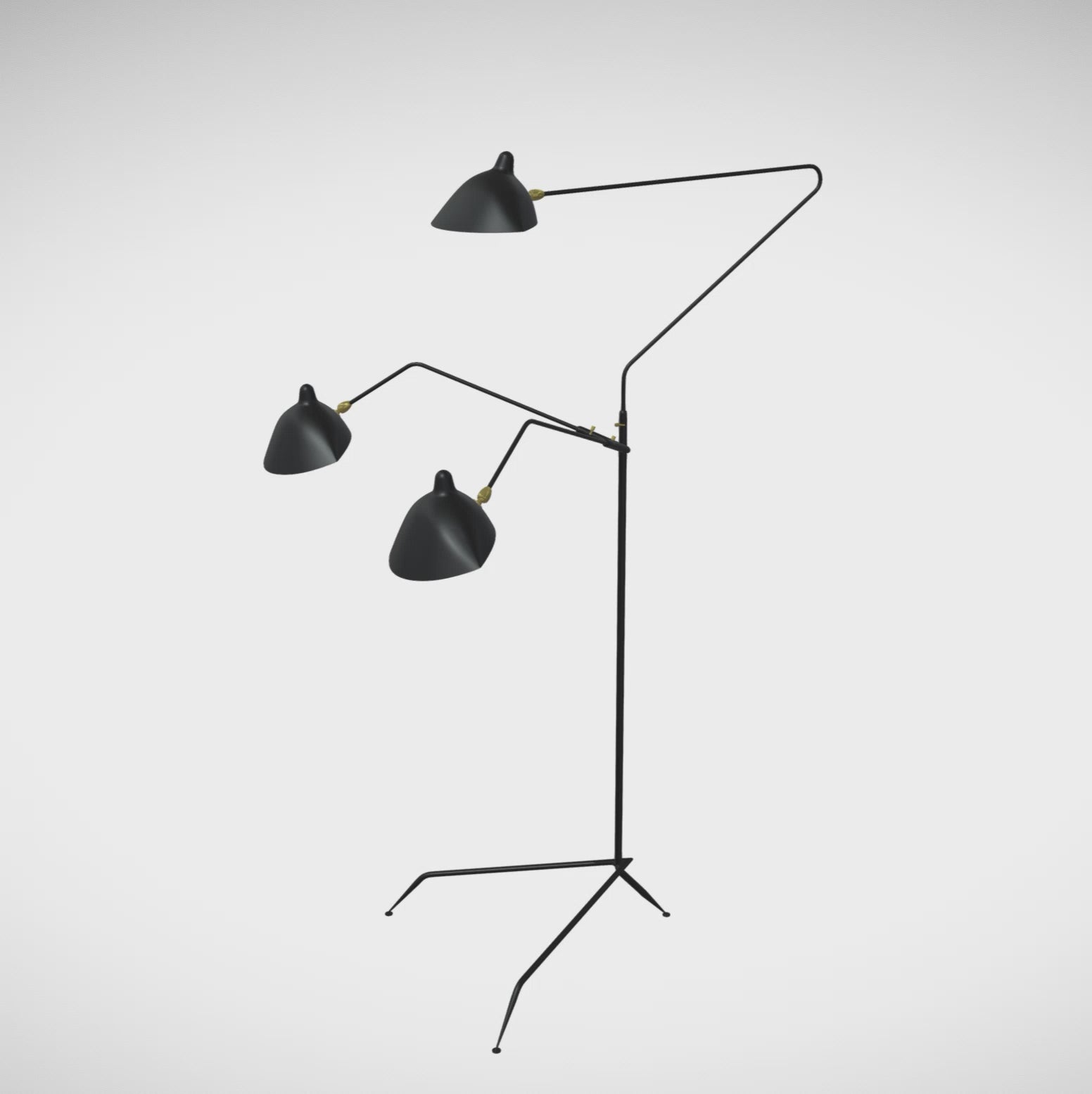 This is the most versatile lamp of the Mouille collection. Each ‘chapeau’ shade can be oriented differently. Sculptural in form with 3 rotating arms, it stands majestically on a tripod base ending with tapered legs.